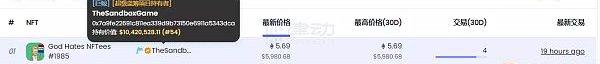 不到2个小时以后,Sandbox就被宣告「拿下」。交易记录显示,TheSandboxGame的官方钱包在23点25分左右买入了19个GodHatesNFTs,其中有两个分别以5.69ETH和3.69ETH成交,刷新了这个NFT系列的最高交易榜。