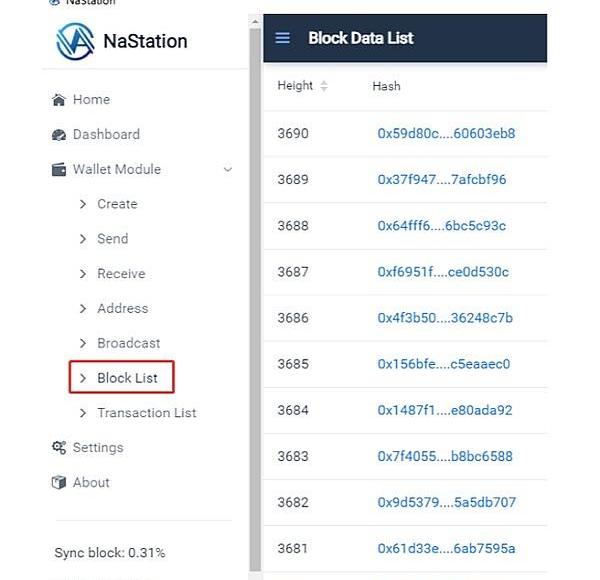 同时,我们在NaStation桌面钱包首页左侧可以发现目前共有?5个栏目,分别是“首页”、“仪表盘”、“钱包模块”、“设置”、“关于”,在钱包模块下包含创建、发送、接收、地址、广播、区块列表、交易清单等选项,允许用户进行存储、转账、交易、查询,其中区块列表将为用户显示最新的100个区块数据,以帮助交易者及时查看到哈希达成情况。