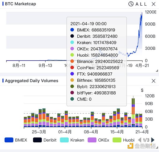 受狂热牛市,全球传统巨鳄入场,截至2021年3月25日,2021年数字资产衍生品市场中,金色数据追踪统计的50家交易所永续合约交易量已达13.4万亿美元,仅永续合约成交量便已经超越去年全年衍生品成交量总和(12.314万亿美元),仅4月18日BTC暴跌1万美金,合约交易量更是破新高3000亿美金。
