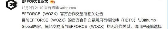 不过,Efforce与沃兹的选择颇令外界意外,它并没有选择传统意义的老牌交易所首发上线,而是选择了一家头部交易所HBTC首先上线其代币WOZX。12月3日,HBTC正式开放WOZX代币交易,至今最高上涨30余倍且未大幅回调,成为一二线交易所中12月以来涨幅最高的代币,这意味着Efforce的意料之外的选择有其必然的理由,方才推动这次上币合作对双方都实现良好的效果。