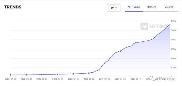目前NFT已经经历了三轮牛市。NFT的首次爆发在2012 年,归功于第一个将要建在比特币网络上的类似 NFT 的代币——Coloured Coins,又名 Bitcoin 2.x。此后,NFT 不断发展,可以追溯到 2016 年 Counterparty.io 推出的 Rare Pepe Directory 项目和2017 年 John Watkinson 和 Matt Hall 推出的 CryptoPunks 项目。而 NFT 领域真正的繁荣始于 2017 年底,2018 年初以太坊热潮中推出的 CryptoKitties,致使人们对 NFT 活动关注度飙升。