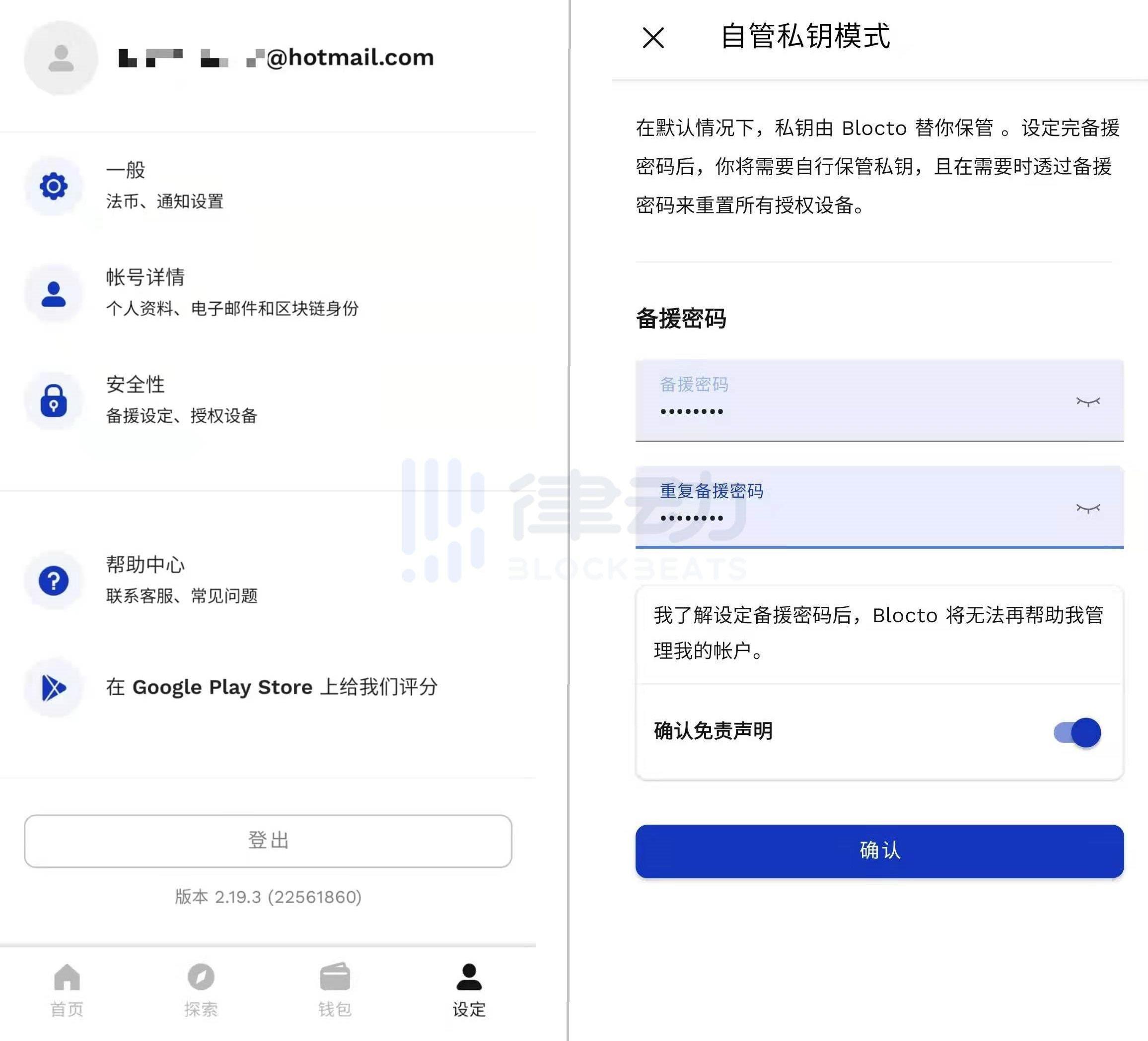 以Blocto钱包为例,Blocto在用户体验上重建了Web2.0时代的用户体系。普通用户只需使用邮箱地址注册即可登录钱包,此举极大的降低了区块链新人的进入门槛。但这并不代表用户无法掌握自己的私钥。为了迎合不同用户的需求,用户可在设置中自行将钱包从托管模式切换为非托管模式,将私钥自行保管。