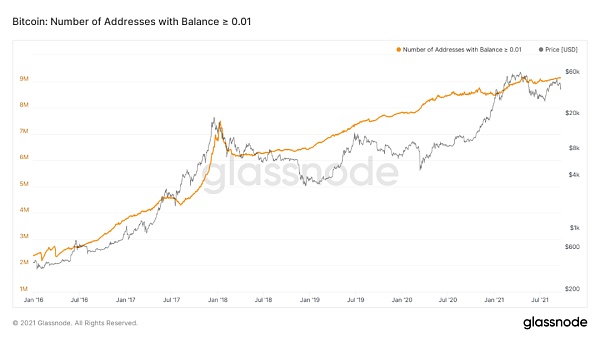 从上图可以看到,在2017年12月,持仓不少于0.01枚比特币的地址是大约是688万个,而到了2021年9月,这一数据已经超过了910万,在将近四年的时间里,涨幅约为32.3%。不过,就2018年~2021年的增速来看,显然是落后于2015年~2017年间(179.7%)的增速的。