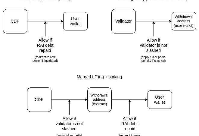 Eigenlayer是一组工具,通过将提款地址设置为仅在满足某些条件情况下才返还资金的合约,它使质押者可以在其他应用中重新使用其质押权益。可以想象,人们可以制作一个使用Eigenlayer的RAI版本:用户通过将取款地址设置为一个合约,将他们质押的ETH存入CDP中,该合约只有在他们偿还RAI债务后才会返还。如果用户被清算,合约的逻辑会将ETH的所有权转移给清算人。