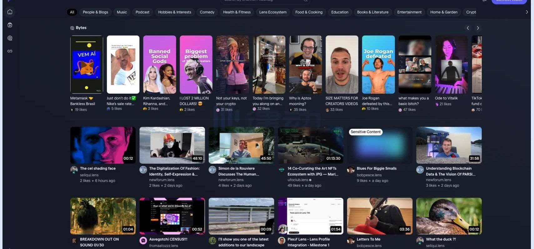 LensTube,LensTube是一个去中心化视频共享平台,旨在成为Web3.0的Youtube。LensTube的视频内容存储在去中心化视频存储设施Livepeer上,用户可以基于图谱NFT与自己的粉丝分享和欣赏视频,并通过打赏、收藏等方式获得来自社区的奖励收益。