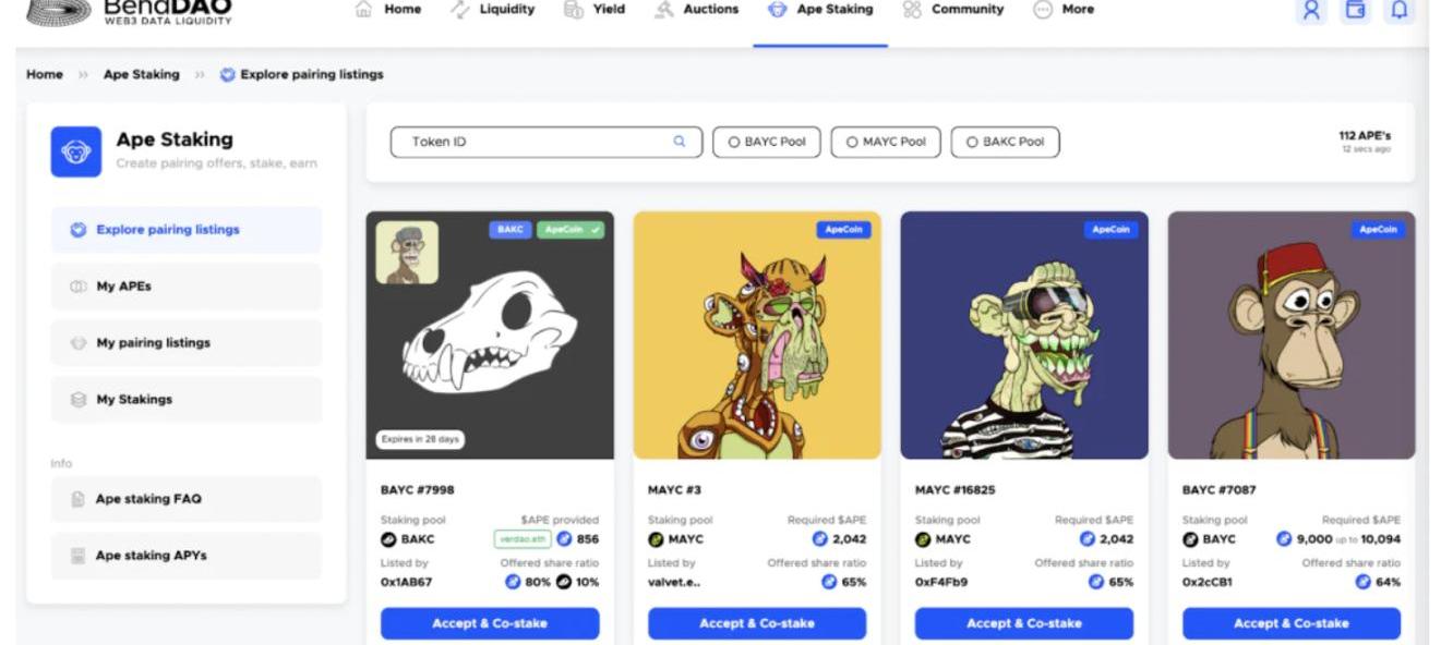 https://www.benddao.xyz/en/apecoin-staking/explore-pairing-listings/BendDAO采取的ApeStaking产品设计思路,不同于ParaSpace的Peer-to-Pool逻辑,而是采取了一种用户自由度更高的Peer-to-Peer模式。当每一个BAYC/MAYC存入BendApeStaking平时时,NFT的持有者自由可以设定几个参数:1,ApeNFT、APE代币、BAKC配对质押者每个角色分得的总APE代币奖励的百分比。2,APE代币质押的数量要求。对于APE代币的持有者来说,他们可以选择任意一个ApeNFT配对进行质押,但是最重要的选择依据肯定是ApeNFT持有者预先设定的奖励分配比率。