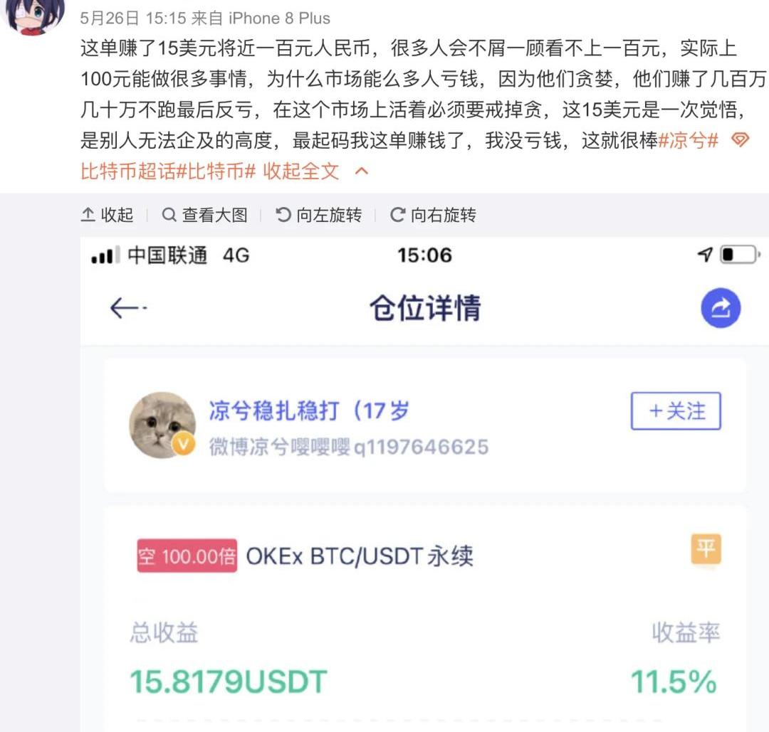 更有网友整理出“凉兮圣经”随着“春晚”的落幕,我们将关注的焦点从这一短暂的狂欢移走。回顾凉兮走红的前半程,有人说他偏执、疯狂、表演型人格,但也有人称之为天才少年、为交易而生、下一个孙宇晨,而其感情故事更是令吃瓜网友津津乐道的话题。多面性和复杂性,在这个顶流的少年身上体现的淋漓尽致。他所受到的评价——无论正面或负面——或许都比其他任何一个币圈KOL更要多,这可以说是偶然,但在这个疯狂造富又时常一夜大厦倾塌的行业,也是必然。年少成名,牛市做空月赚千万“耿先昭,把你爹的钱还回来,你他妈的还钱!再不还钱报警抓你!”很难想象,这是一个儿子对父亲的喊话。在整个电话聊天的过程中,双方都不时地爆出粗口,儿子甚至还以“你爹”自称。言辞的激烈,全然让人无法相信这是一对父子。而谈话的内容,则主要围绕着“还钱”二字。耿先昭是耿至宇的父亲,这两人就是谈话中的这对父子。这段对话发生在2021年夏季,彼时耿至宇在币圈已小有名气。而这条与父亲电话交谈的视频,让他的名气从币圈出圈,被网友称为“币圈孝子”。据耿至宇自己的描述,因自己年仅17岁尚未成年,无法办理自己的银行卡,所以委托其父代为保管了一百多万人民币。而现在因炒币爆仓,想取回这些钱作为本金,再度“冲进去”放手一搏。值得注意的是,耿至宇并非生于富贵之家。这笔巨额财产并非来自家庭的馈赠,而是他从跌宕起伏的币市上自己赚取的。“我不能办理银行卡,把钱提现到了耿先昭的卡,现在我急需用钱,他不给我了,我已经报警了。”耿至宇微博名“凉兮嘤嘤嘤”,被网友称为凉兮。当时,年仅17岁的他在视频中表示,自己通过1000块钱本金,在币市上采用高达100倍的杠杆快进快出,短线操作,在短短的一个月内就攫取到了高达数百万的利润。2021年6月,已满18岁的凉兮,终于拥有了自己的银行卡,网络ID中的“17岁”也改为“18岁了”。