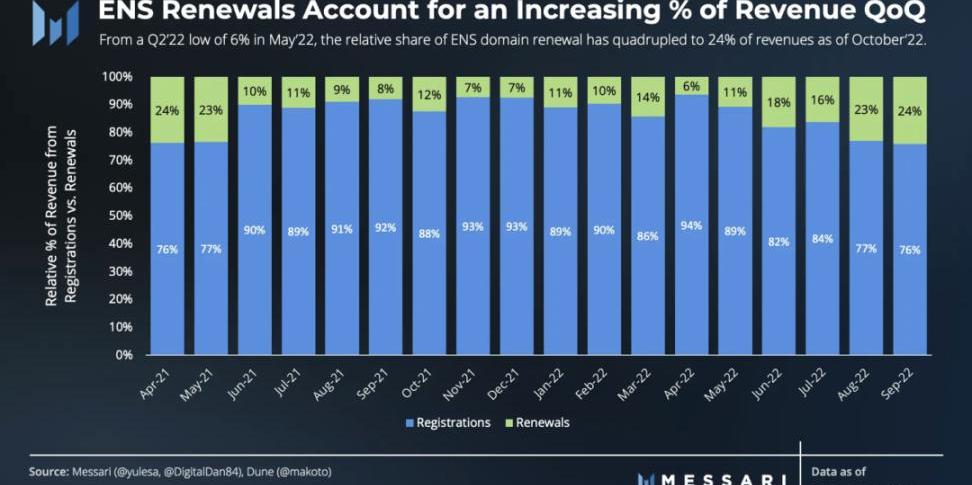 虽然5月份发布了大约400个ENS域地址,但到8月,这个数字增长了12倍,达到大约4,900个。截至10月,已有超过23,000个名称需要续订。很大比例的ENS地址持有者正在续订他们的地址这一事实可以解释为什么来自续订的收入百分比大幅增加。