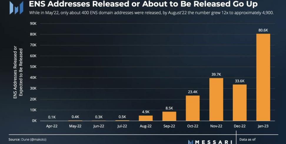在过去两个季度中,ENS域名续订已占总收入的很大比例。从5月份的22年第二季度低点6%开始,ENS域名续订的相对份额已翻了两番,截至10月份占收入的24%。这种增长的一个潜在解释是在未来几个月内释放或预计释放的ENS名称数量大幅增加。