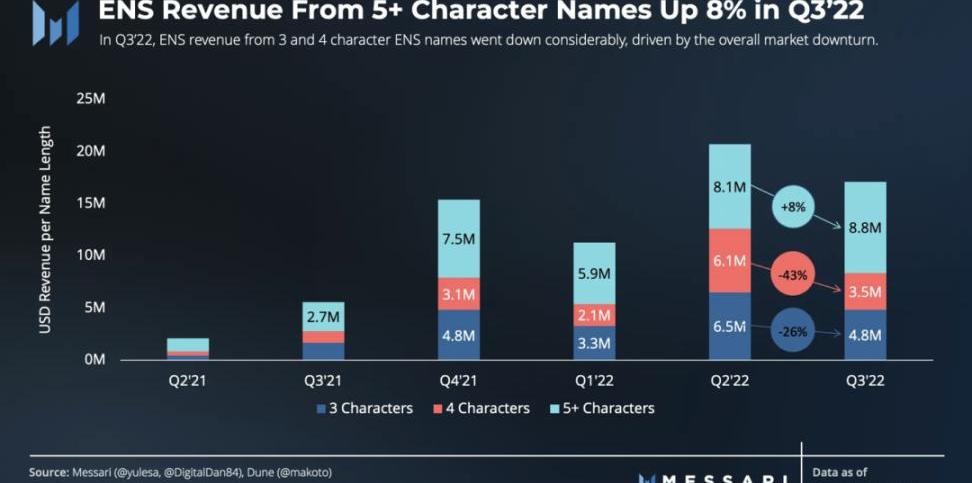 评估ENS收入时值得考虑的另一个方面是注册和续订的类型。注册和续订3-4个字符的ENS名称的成本大大高于注册5个以上字符的ENS名称。截至2022年9月,注册ENS域名的平均成本可分为三层:332美元、92美元和7美元。同样,截至2022年9月,续订ENS域名的平均成本为:191美元、66美元和6美元。在22年第二季度,人们争先恐后地铸造3和4个字符名称和短词。随着这些类型的ENS名称数量的减少,创造昂贵名称的机会也减少了。由于可以注册这些昂贵的名称,相对于5个以上的字符名称,3和4个字符名称的注册收入份额在22年第三季度显著下降。鉴于价格层级的这些差异,来自5个以上字符名称的注册和续订的美元收入仍环比增长8%。定性分析
