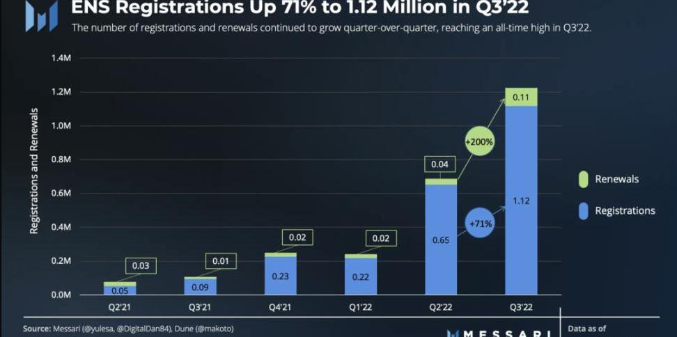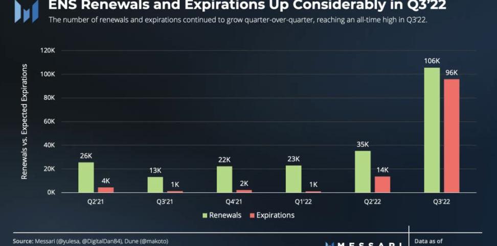 ENS在22年第三季度达到112万个域名注册的历史新高,环比增长71%。同时,ENS域名续订量从22年第二季度的35,135次增长到22年第三季度的105,546次,增长了3倍。必须在发生续订时的预期到期时间的背景下理解续订环比的显著增加。