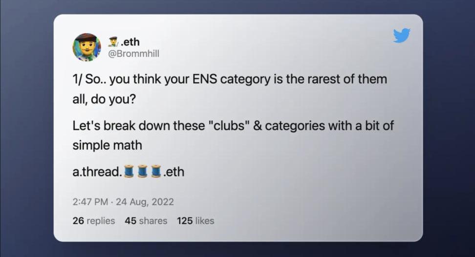 来源:Twitter尽管注册和续订数量有所增加,但并非所有ENS域名都是平等创建的。事实上,3个字符和4个字符的名称出现的频率低于5个以上的字符名称。默认情况下,注册和更新3或4个字符名称的成本更高:每年注册分别为640美元和160美元,而5个以上字符名称每年只需5美元。在名称长度的范围内,不同的字符组合具有不同的稀有性。注册和续订相对于名称长度的分布揭示了ENS名称持有者对稀有性的看法。