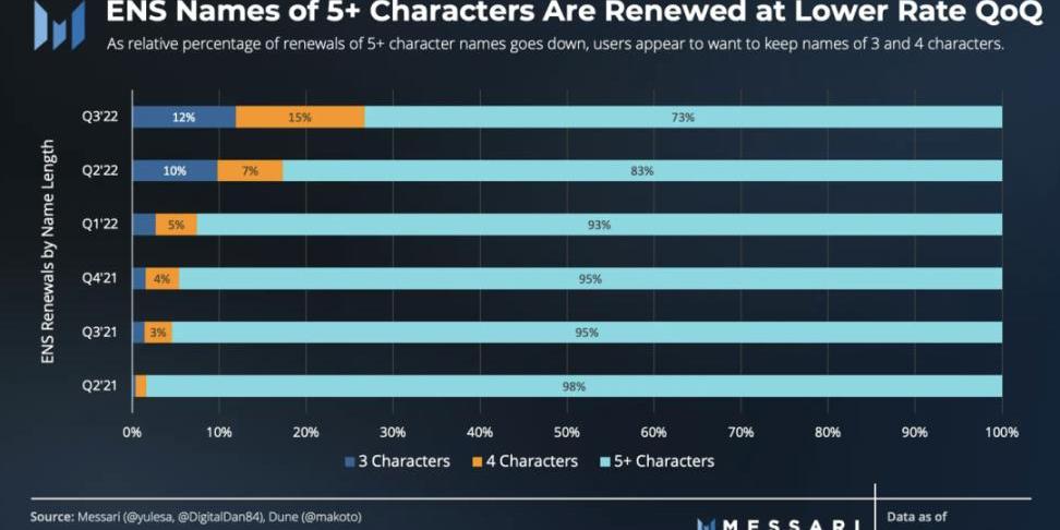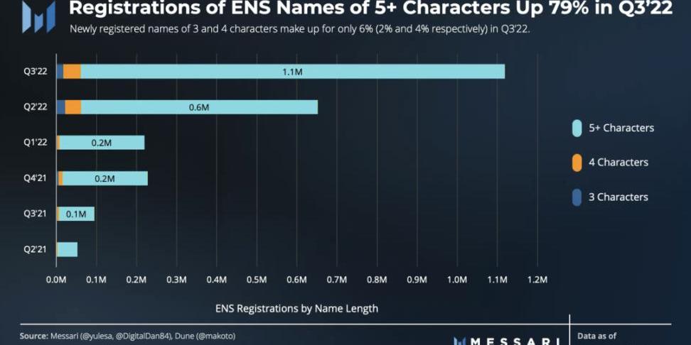 就ENS名称长度而言,在22年第三季度的所有112万个注册中,超过5个字符的名称占106万个。值得注意的是,从22年第二季度的60万到22年第三季度的110万,绝对值环比增长79%,超过5个字符名称的注册增长速度快于整体ENS注册。存在两种可能的解释:较长的名称更便宜,流行的3和4字符名称已大量注册。这种成本和稀缺性的结合导致注册了更多5个以上的字符名称。