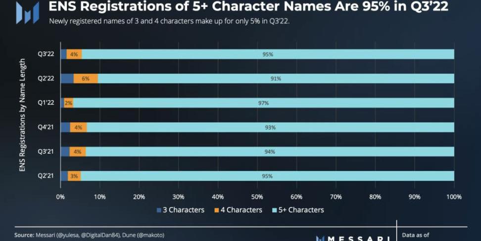 尽管3-4个字符域名的销量有所增加,但ENS注册5个以上字符域名的相对百分比在过去六个季度中始终保持在90%以上。