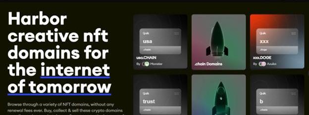 Quik是一个提供NFT域名和子域名的市场。只要完成mint,用户就无需支付续费。该平台支持PC、iOs和Android设备,支持IPFS,允许用户在网络上发送和接收文件。由于它的去中心化域名,Quik用户能完全掌控他们的网站,可以将它们转移到他们的私人钱包,或在平台内像OpenSea这样的市场上出售它们。在Quick上至少有10个可用NFTTLDs。.metaverse、.vr、.chain、.address、.io、.bored、.doge、.shib、.btc、.web3等结尾的域名都可作为Quick的域名使用。