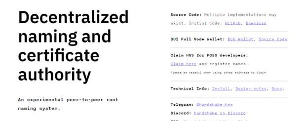 NEMDNS是一个chrome扩展网络,允许用户在NEM区块链上搜索.nem网站。它是完全去中心化的、抗审查、易于安装、不需要额外的软件。用户还可以随时更新域记录。Handshake