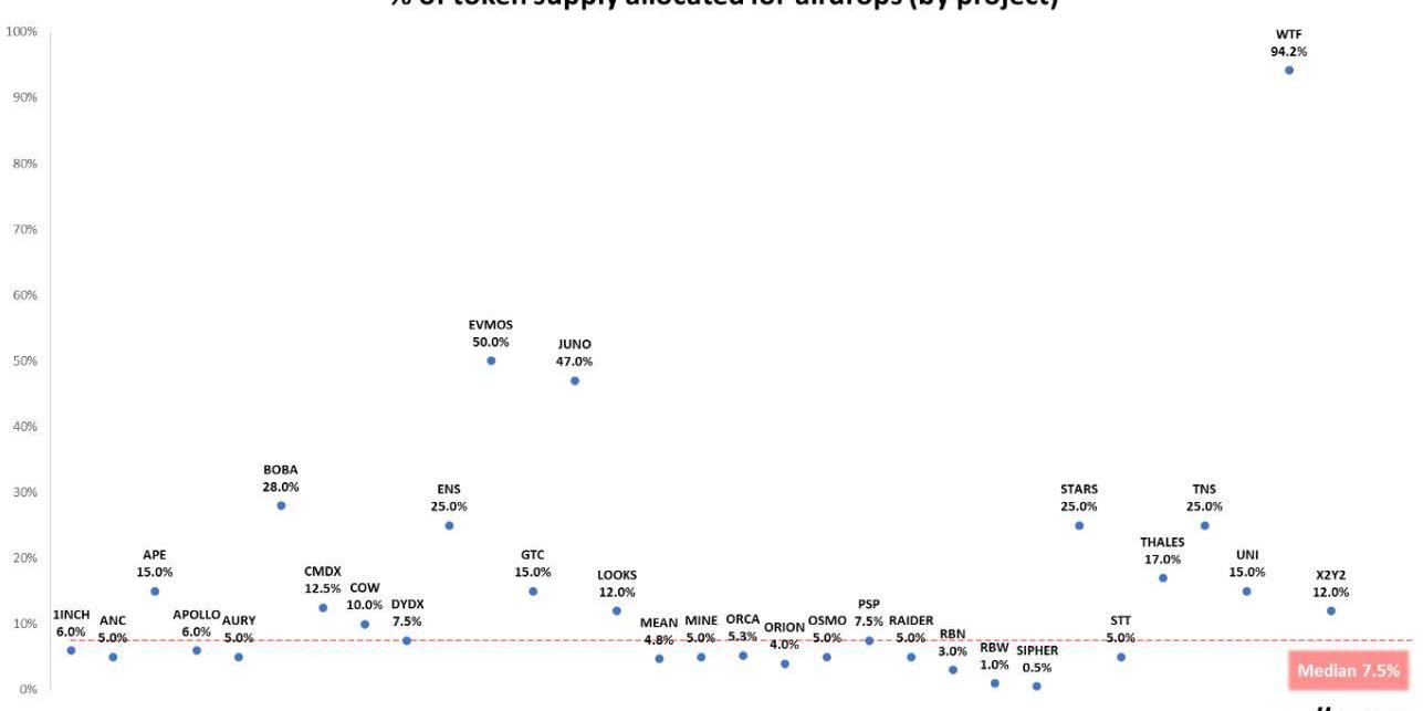 相比之下,项目方倾向于为投资者分配约10%的代币总供应量,为团队成员分配约15%,因此对于决定进行空投的项目来说,留出7.5%的代币供应量是一个很大的比例。那么为什么要为空投分配这么大的百分比呢?