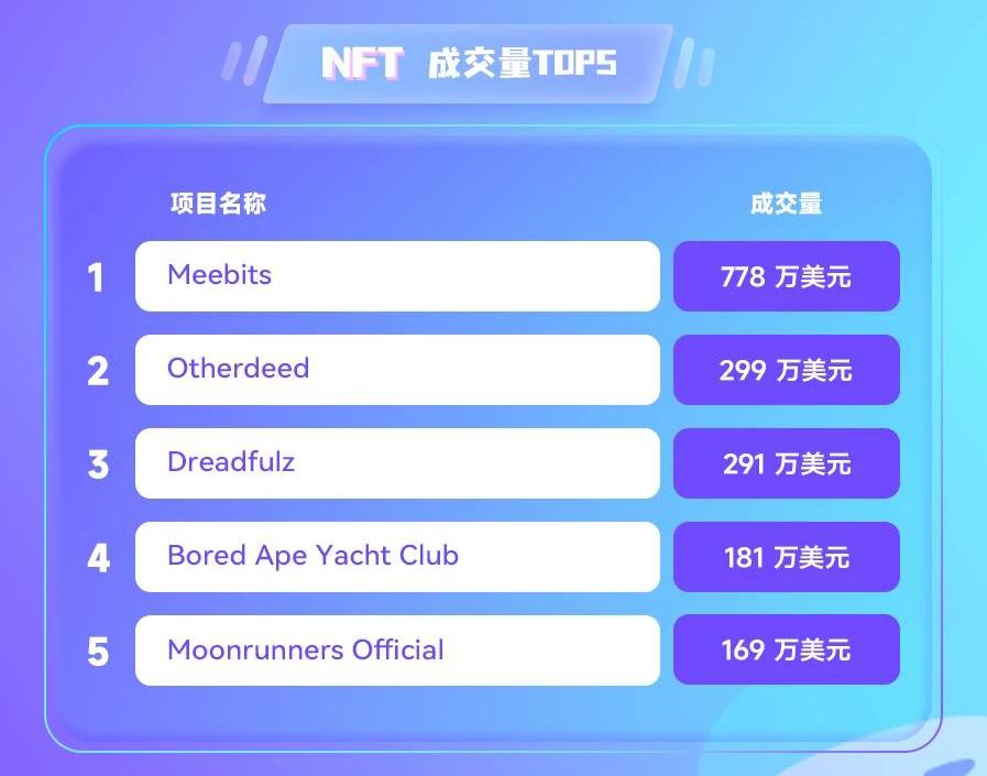 按过去24小时成交量,排名前五的项目分别为Meebits、Otherdeed、Dreadfulz、BoredApeYachtClub和MoonrunnersOfficial。
