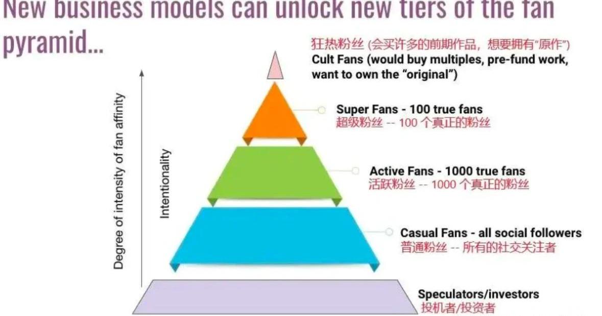 在将作品代币化为NFT的过程中,创作者得以创建一条有关作品所有权和来源的可验证链上记录。这个过程最终将铸造出一种独一无二的资产(NFT),该资产可以追溯到该创作者。总体而言,我们希望所处的世界会从一个创作者需要依附于平台赚取收入,转变为他们可以依靠自己或者与社区一起创造财富。Web3对创作者经济产生的两个最显著的改变在于:改变了利益分配机制;区块链网络本身,只是一个“作品陈列馆”。创作者拥有并保留版权,可以将作品直接上传到公链完成商业化,没有中间商的环节来分取利润。创作者能够利用NFT创造各种各样的付费、与粉丝互动的方法。改变了传统信任机制。在web2时代我们依赖于知识产权法这个钝器对创作者及其版权进行保护,web3我们希望基于智能合约进行。数字资产从创建到消费都有了更好的权限保障,创作者将获得合理的利益分配和内容所属权力,同时规避各类版权起诉和盗版猖獗等问题。具体举例而言,创作者可以发行有“限定感”和“稀缺性”的专属NFT。对持有某个创作者的NFT,作为加入某个DAO的证明,可以用来表达和展示自我、确认彼此独特身份的“徽章”。在如下场景中创造价值:赢取喜爱的乐队发行的NFT,可以获得来演出后台见面互动的机会;为偶像氪金时获得NFT作为凭证,证明自己对idol的经济贡献;在创作者初出茅庐时购买他们的NFT,能够在其未来走红后溢价卖出,获得内容投资“红利”等。我们畅想未来,也许两个追星发烧友见面之前就可以扫一扫彼此的二维码看看对方收藏的NFT,了解他的兴趣和贡献。或者基于身份认同和内容消费观念,在共同的社区中劳动——创建内容,消费内容,投资内容。3.2新模式的引入能否解决已有的创作者利益和内容权力分配不够公平的问题?