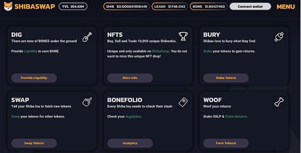 截至目前,Shiba Inu已经形成了Shibswap、Shibshis 游戏、Shiba公益等产品和使用方向,其中Shibswap形成了SHIB(基础货币)、LEASH(激励代币)、BONE(治理通证)三Token运转的经济系统,并提供挖矿、NFT、燃烧、交易、股权激励、质押等功能。