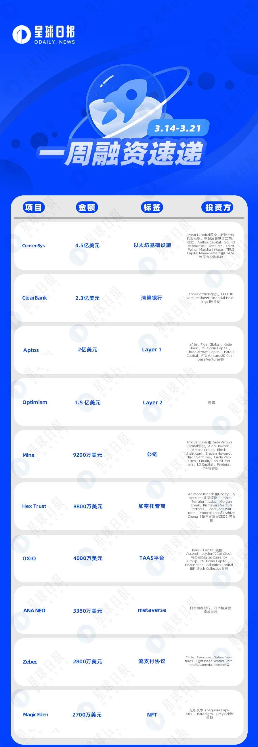 以下为具体融资事件:ConsenSys完成4.5亿美元融资,ParaFiCapital领投,淡马锡、微软等参投据官方消息,以太坊基础设施开发公司ConsenSys完成4.5亿美元D轮融资,估值达到70亿美元,ParaFiCapital领投,新投资包括淡马锡、软银愿景基金二期、微软、AnthosCapital、SoundVentures和CVentures,ThirdPoint、MarshallWace、TRUECapitalManagement和UTAVC等原有投资参投。ConsenSys表示,该轮融资的收益将转换为ETH,以根据ConsenSys的资金策略重新平衡ETH与美元等价物的比率。据介绍,ConsenSys是为Web3创建基础软件的先驱,其使命是通过使DAO、NFT和DeFi普遍易于使用、访问和构建来释放社区的协作能力。清算银行ClearBank完成2.29亿美元融资,ApexDigital领投清算银行ClearBank宣布完成2.3亿美元融资,由ApaxPartners领投,CFFIUKVentures和PPFFinancialHoldingsBV参投。据悉,ClearBank是一个基于云的清算银行,目前为包括Coinbase、Gemini、Tide、OaknorthBank在内的200多家公司或机构提供服务。前FacebookDiem团队主导的Aptos完成2亿美元融资,a16z、MulticoinCapital等参投星球日报讯Apotos已完成包括a16z、TigerGlobal、KatieHaun、MulticoinCapital、ThreeArrowsCapital、ParaFiCapital、FTXVentures和CoinbaseVentures等数十家web3知名投资机构的2亿美元投资。据悉,Aptos由前meta员工主导成立,旨在接手开源的前Diem项目并继续实现其去中心化网络的愿景,服务数十亿用户,并为大型企业客户提供服务。“我们是Diem的最初创造者、研究人员、设计师和建设者,虽然世界从来没有看到我们建造了什么,但我们的工作远未结束。”Aptos的CEOMoShaikh在一篇博客文章中写道。此前,SilvergateCapital以1.82亿美元收购了Diem资产,Facebook创建加密支付网络的大胆尝试戛然而终。Optimism以16.5亿美元的估值完成1.5亿美元B轮融资以太坊二层解决方案Optimism官方博客称,在主网上使用一年多后,Optimism为用户节省了超过10亿美元的Gas费,已部署数以千计的合约;Optimism代码在主网上的三个分支。此外,Optimism宣布,最近以16.5亿美元的估值完成1.5亿美元B轮融资轻量级区块链协议Mina完成9200万美元融资,FTXVentures和ThreeArrowsCapital领投轻量级区块链协议Mina完成9200万美元战略和私募融资,FTXVentures和ThreeArrowsCapital领投,AlanHoward、AmberGroup、Blockchain.com、BrevanHoward、BixinVentures、CircleVentures、FinalityCapitalPartners、LDCapital、Pantera、IOSG等参投。Mina将使用该笔资金加速零知识证明的采用。HexTrust完成8800万美元融资,AnimocaBrands和LibertyCityVentures领投加密托管商HexTrust完成8800万美元B轮融资,AnimocaBrands和LibertyCityVentures共同领投,Ripple、TerraformLabs、MorganCreek、PrimaveraVenturePartners、LeadBlockPartners、ProtocolLabs和AdrianCheng等参投。B轮融资资金将用于把业务扩展到欧洲和中东并获得许可证。HexTrust于去年3月份完成600万美元的A轮融资,并于10月份完成AnimocaBrands领投的1000万美元融资。HexTrust目前在中国香港、新加坡和越南的办事处拥有100多名员工。数字资产TAAS平台OXIO完成4000万美元B轮融资,ParaFiCapital领投星球日报讯基于区块链的数字资产“电信即服务”(TAAS)平台OXIO宣布完成了一笔4000万美元B轮融资,ParaFiCapital领投,Ascend、Leydon和CoinDesk母公司DigitalCurrencyGroup、以及之前投资过该公司的MulticoinCapital、Monashees、AtlanticoCapital和FinTechCollective参投。筹集资金将用于加速OXIO在墨西哥的业务、将其网络扩展到美国和巴西,并计划扩大公司在美国和墨西哥的产品和工程团队。据悉,OXIO正在带宽和互联网连接领域等非金融应用程序上探索加密货币业务,提供一种白标产品,允许任何品牌推出移动服务。目前,该公司在墨西哥拥有15家客户,包括该国最大的面包制造商GrupoBimbo和送餐应用程序Rappi。日本ANA控股旗下元宇宙子公司ANANEO完成约3380万美元融资日本ANA控股旗下元宇宙子公司ANANEO完成45亿日元的融资,日本南都银行、日本信用金库等参投,资金将用于网上虚拟旅行和虚拟商城的服务开发。Solana流支付协议Zebec完成2800万美元融资,Circle、Coinbase等参投Solana生态流支付协议Zebec已通过代币公开销售和私募融资2800万美元,并推出ZBC代币。其中2100万美元的私募投资者包括Circle、Coinbase、SolanaVentures、LightspeedVenturePartners和AlamedaResearch,另外700万美元的代币公开销售是与Republic合作完成。据悉,Zebec协议为金融交易提供实时、连续的资金流,核心ZebecPayroll解决方案允许员工以USDC和其他稳定币获得报酬。ZBC代币将作为Zebec去中心化自治组织的治理代币,Zebec还计划为代币持有者提供质押奖励,并为基于该协议的开发人员提供奖励。Solana链上NFT市场MagicEden宣布完成2700万美元融资,红杉资本等参投Solana链上NFT市场MagicEden宣布完成2700万美元融资,红杉资本、Paradigm、Greylock等参投,估值未知。红杉资本合伙人ShaunMaguire表示,OpenSea存在弱点,主要依赖于效率较低的以太坊区块链,因此押注MagicEden,希望在OpenSea进入Solana生态之前抓住这一优势。根据科技博主JaneManchunWong对OpenSea代码的分析,OpenSea已经对Solana区块链进行了测试。OpenSea拒绝置评是否或何时采用Solana。链游CryptoUnicorns完成2600万美元融资,TCG、BackedVC领投链游CryptoUnicorns宣布通过出售Token完成2600万美元融资,本轮融资由TCG、BackedVC领投,BITKRAFTVentures、DelphiDigital、InfinityVentureCrypto、PolygonStudios、CoinFund、BreederDAO、Emfarsis和ACMECapital等参投。据悉,筹集资金将存放于CryptoUnicornsDAO金库。链游平台C2X以5亿美元估值完成2500万美元私募融资,FTXVe