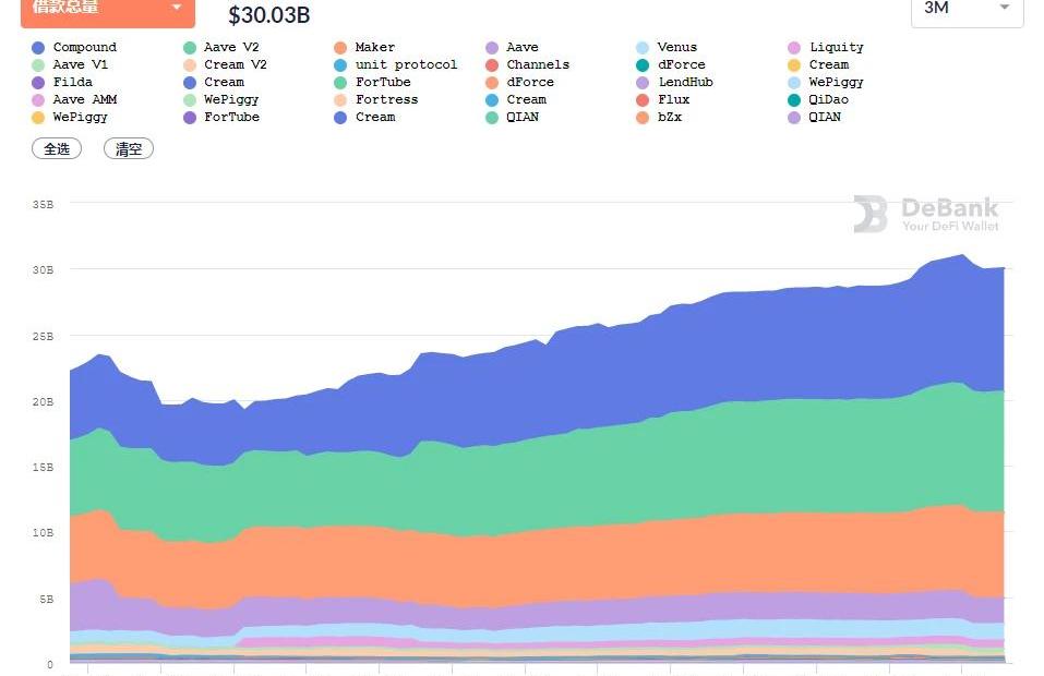 TVL前15名的借贷协议,数据来源:DefiLlama就未偿借款来说,目前所有借贷协议的未偿借款金额约为300亿美金。