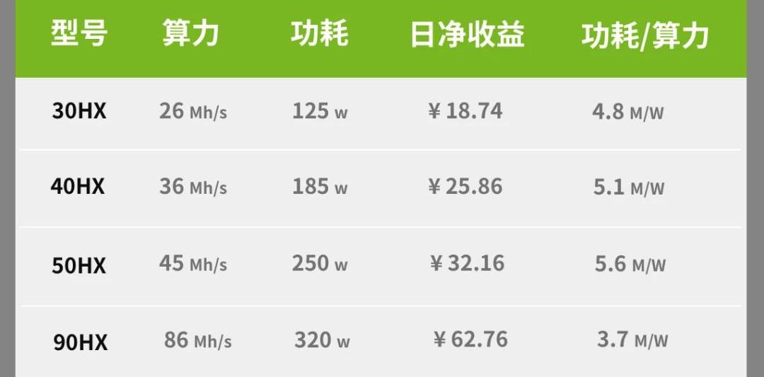 图片来自英伟达官网从英伟达对CMP系列产品的规格设计中可以看到,他充分考虑到了DAG文件大小的问题,最小显存就是6GB,为以太坊而生无疑。按照CMPHX的规格参数,我们大致可以算出每款卡的收益: