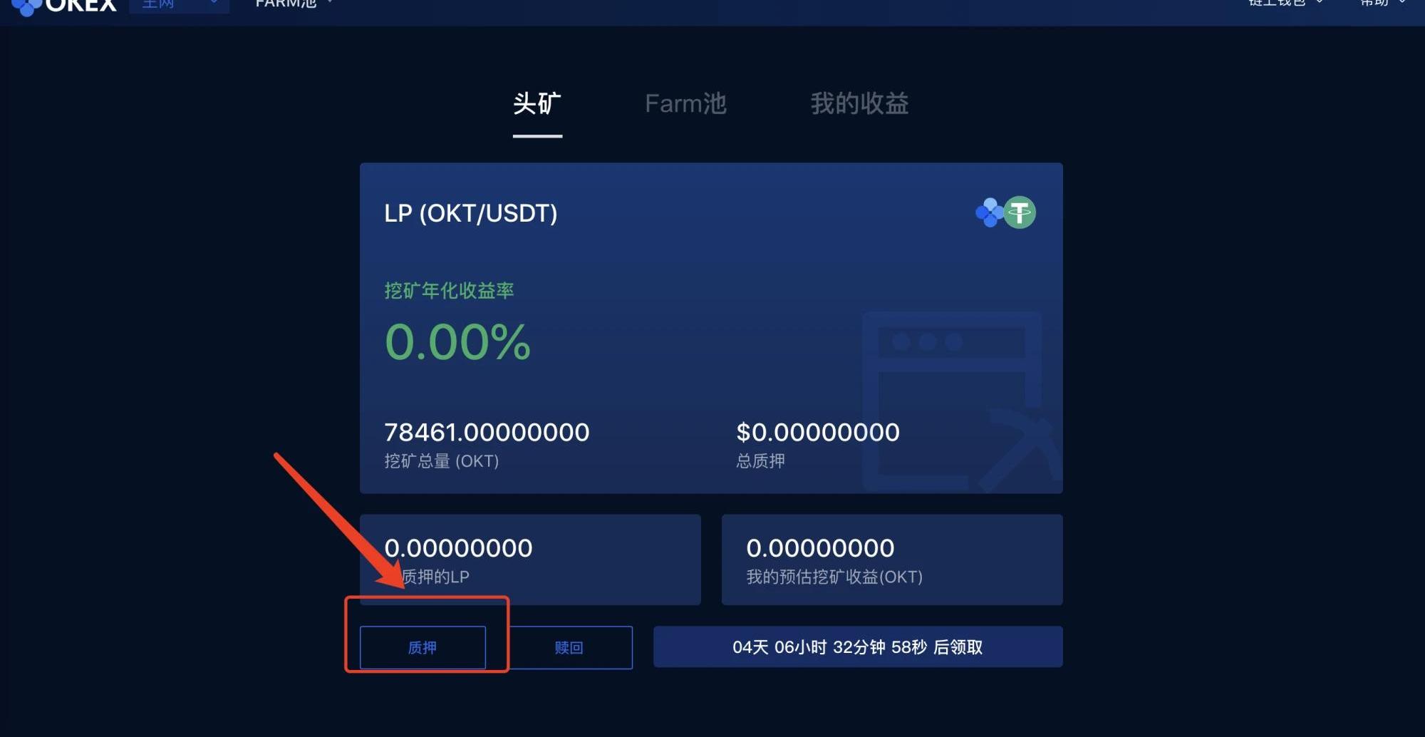 5、质押LP到头矿池获取OKT奖励获取LPToken成功后,回到Farm页面的第一个头矿Tab,点击质押,即可将你的LP(OKT-USDT)质押到头矿池。