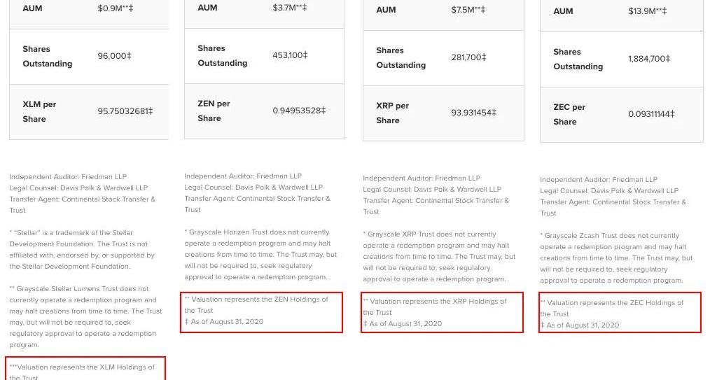 编者按:本文来自区块律动BlockBeats,Odaily星球日报经授权转载。12月30日,灰度在推特上照常更新了每日资产管理规模变化,但是官网关于信托份额的统计数据的截止时间发生了改变,从此前的「11月30日」更改为更早的「8月31日」,导致大量抓取官网数据的网站数据发生错误。据律动统计,更改截止时间的信托包括Stellar信托、ZEN信托、XRP信托、ZEC信托。