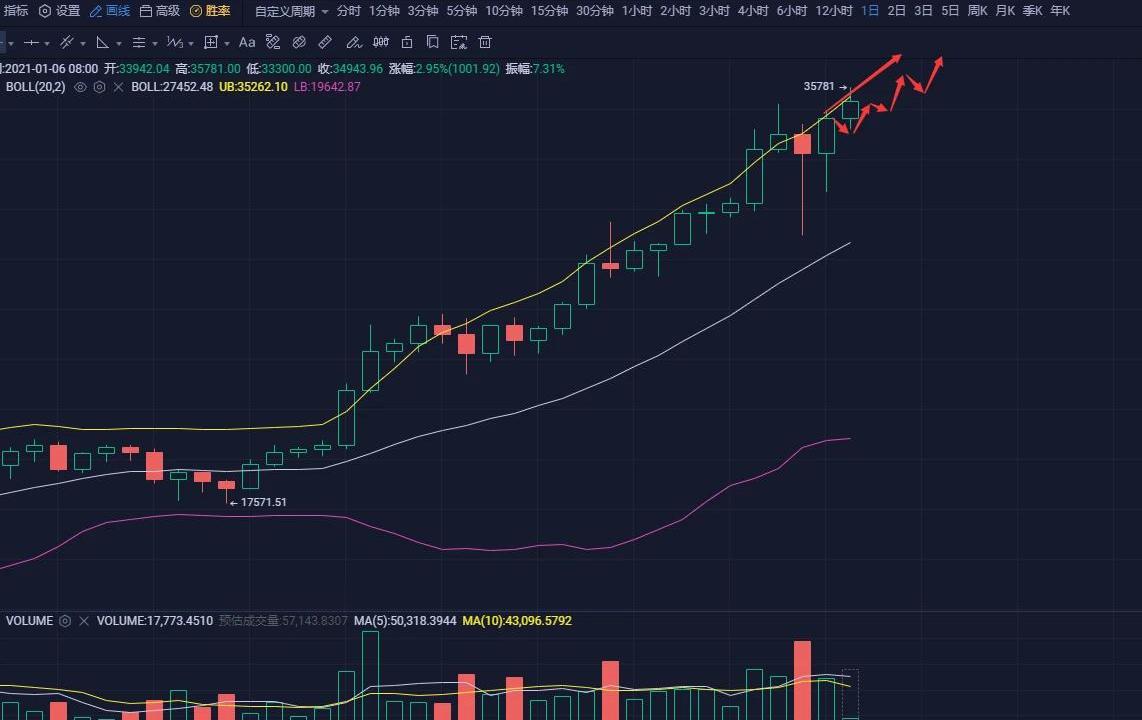 人民日报APP的官方性质不必多说,每日经济新闻更是国内的主流财经媒体,往常这类主流媒体对比特币这样的金融资产不仅是不欢迎,甚至是以消极为主,而当前态度有这样的转变也是比较令人意外的。可能在大家看来,这样的新闻播报对比特币虽然起到些积极性的影响,但影响性没有大到值得激动的地步,犯不着如此受宠若惊。但大家有所不知的是,从明面禁止到松口这本身就是转折点。退一万步来说,即使目前在官方看来,比特币等同于正常的资产、普通人可以参与的资产,但也难改其依然属于高风险的事实,以官媒的保守做法来看,也不会大力鼓吹大家投资比特币,因此从态度上,对比特币的支持始终是有限的,如果要等到官方说“比特币是优质资产,支持大家踊跃参投”这样的话才证明对比特币的态度改变,那恐怕永远是等不到的。当前只能去揣测官媒细微的态度改变才能感受到,当下对比特币的风气转变,以今天中午行情突然拉盘为例,大家都知道,当下白天基本上是国人控制行情,而能令国内庄家在白天这个时机突然拉盘的因素,不排除当下市场感受到了这股微妙风气改变的可能性。在这里我们有一个大胆的设想,真实性不做保证,只是个人的主观看法,大家可以参考一下。当下股市环境比较一般,今天又是千股下跌,前几天主流媒体还发布了一条关于2020年股民人均盈利10多万的信息,该信息在一般股民中引起了轩然大波,但此时股市表现不佳,在这个年底股市资金都外流的情况下,拉盘的难度非常大,正好现在比特币表现好,因此主流财经媒体用比特币适当的分担一下国内投资者的注意力,让大家的目光不仅仅是集中在股市,让当下的投资环境不再那么低迷。当然这一点并不一定是某一方面的特别授意,也有较大的概率是媒体出于自身流量的考虑,国内财经方面的主要流量还是来自于股民的关注,而年前本身投资氛围就低迷,股市略显平淡甚至夹带着负面能量,并不利于媒体流量的爆发,而比特币无论是在话题性还是价格标新来看,对于国内投资者来说都是一个比较新鲜的刺激,反而有可能引起大家的关注,也有利于媒体保持流量。再来看看最近的XRP,应该是深刻的感受到了什么叫墙倒众人推。据灰度官方消息,自美国东部时间2021年1月15日下午5点起,将暂时停止XRP的交易,并将XRP从灰度数字大市值基金中移除。灰度表示,在周一卖出了该基金中的所有XRP,并买入了更多的BTC、ETH、LTC和BCH。XRP约占该基金的1.46%。修正后的基金成分为BTC、ETH、LTC和BCH。XRP已经被灰度判处了“死刑”,事实上灰度确实有这么做的理由,币种自身的价值是其次,当下美方的监管力度也逐渐趋严,灰度作为当下市场最出名的加密货币基金机构,本就是监管机构的重点监管单位,没有这个必要去触霉头,在XRP正式上法庭之前,能用这样的方式在监管机构那里博得好感,灰度也是相当乐意的。不仅如此,资产总额为23.2亿美元的英国投资公司TetragonFinancialGroup于周一晚上在特拉华州法院提起诉讼。这家投资公司寻求行使其合同权利,要求Ripple赎回Tetragon持有的C系列优先股,并阻止Ripple使用任何现金或其他流动资产,直到Ripple付款。Tetragon还要求法院下达临时限制令,初步禁令和加速审判。这是在XRP的伤口上直接撒盐,在这一系列动作后,持有超大规模XRP头寸的钱包数量迅速减少,在2020年12月21日至2021年1月3日期间,持有至少100万个XRP的钱包地址数量已从1721个降至1567个。在我们看来,钱包数量减少的还不够快,从加密行业从业者以及一个普通投资者的身份看,XRP的行为确实在伤害加密货币行业,XRP的官方行为完全是以伤害投资者的利益来为自己谋求利益,Ripple联合创始人、前CTOJedMcCaleb在过去一年中售出了4.11亿美元的XRP,使其出售XRP的总利润达到5.46亿美元。WhaleAlert报告称,McCaleb剩余的XRP以及其从出售XRP中获得的价值达到12亿美元,使他成为加密市场中最富有的人之一。对于在XRP被割过韭菜的投资者来讲,XRP的罪行用罄竹难书来形容也不过分,相信在对簿公堂之日,XRP项目方也会为其随意增发的行为付出代价。回到行情上,今天开盘后行情先是稍微回踩了一下33300美元,刚好是我们早行情提过的支撑位,到了中午12点左右,直接拉盘不仅刷新了历史高位,一度站上了35000美元,最高时来到超过35700美元。从技术角度讲,昨天是探底回升后的大阳线,今天顺势上涨也在情理之中,只是按照近期行情“白天跌,晚上涨“的规律看,这么早上涨算是有点出乎市场的预料。我们在早行情中也说过,如果是先冲高的话,那会面临回撤的概率,而当前显然是处于回撤中。又到了拿出我们这张近期上涨中时常出现的“万能图”的时候了,并非不会其他指标只抓着一个指标“薅羊毛”,而是其他指标在这样的行情中作用是在是有限,从盘面看,昨天上涨后今天继续冲高已然冲到了Boll上轨之外,随后回撤到轨道内,再次强调一下,该指标不意味着没有继续上涨的机会,只是提醒大家,到了该警惕的时候。