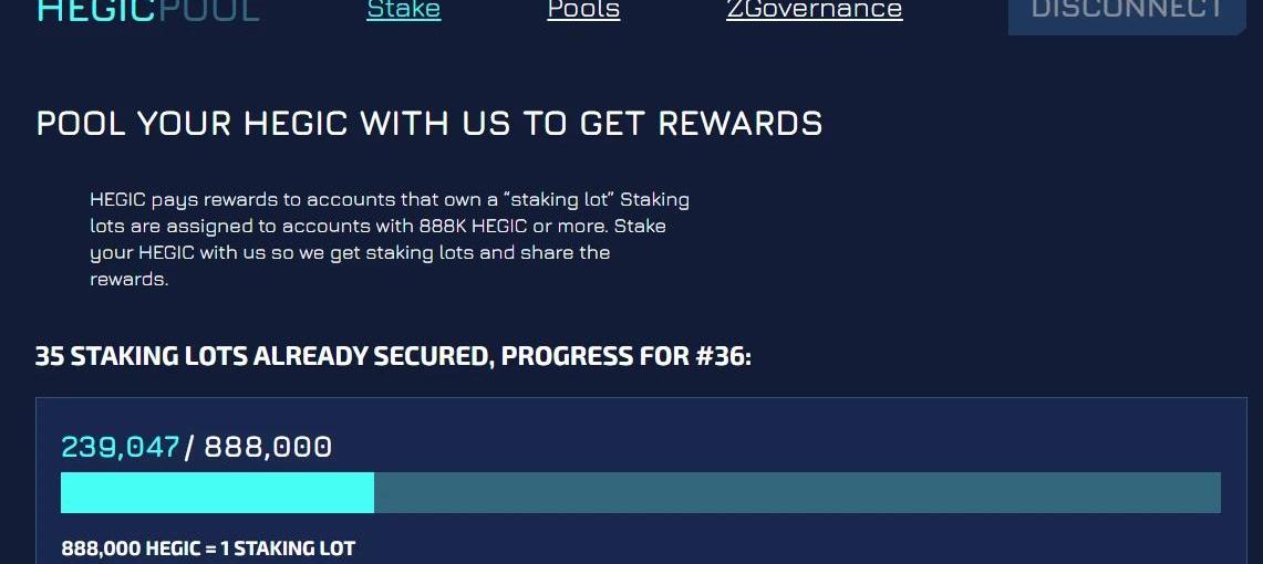 Hegic代币总量3,012,009,888枚,分配比例为:20%:早期贡献者10%:发展基金40%:流动性提供者及持有者奖励25%:联合曲线销售5%:DEX流动资金池提供流动资金其中40%分配给流动性提供者和期权持有者,比例分别为80%和20%。Hegic系统有「质押车位」的概念,Hegic会将期权产生的结算金分配给参与质押的所有人,结算金是期权金额的1%。车位最多只有3000个,每次质押都需要888,000万枚Hegic代币。如果质押车位达到3000个,将会锁定代币总供应量的88.5%。每笔质押都需要888,000个代币,这是一个较高的门槛,绝大多数用户都难以实现,目前可以通过第三方开发的服务来进行质押,入口在官网就可以找到。