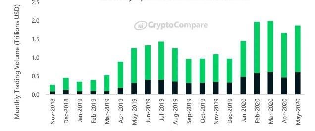 在其初期,加密货币资产类别仅为比特币、莱特币和以太坊等基础加密资产提供现货敞口。然而,随着该资产类别在2016-2017年左右开始成熟,BitMex等交易所推出了以永续掉期和期货合约的形式提供比特币的衍生品,交易者可以通过这些衍生品获得对波动性资产的杠杆敞口。加密货币衍生品越来越受欢迎。这一点可以从2020年5月交易量急剧上升,达到6.02亿美元看到,其总计占市场的32%,其余为现货交易量,达到12.7亿美元。除永续掉期和期货外,Deribit交易所提供的期权在2020年5月的交易量也创下了新纪录,共计1.96亿美元。