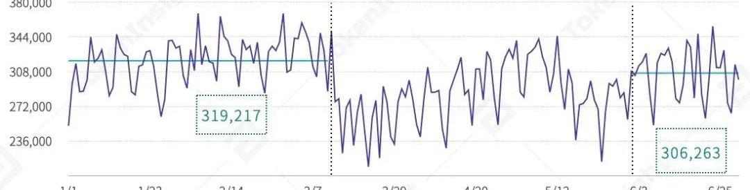 链上交易数,来源:TokenInsight五月份减半至今,市场经过自身的调整,算力已恢复至减半前的水平。同样地,链上交易数也在减半后表现出震荡中攀升的趋势,但和第一季度市场大跌前的活跃度相比仍然存在差距;和312市场大跌前相比,6月份链上日平均交易数下降4%。
