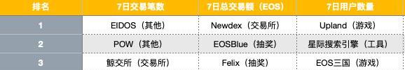 1.EOS:Poker EOS(抽奖,用户884,成交量324万EOS/5400万元);BetDice(抽奖,用户1695,成交量289万EOS/4824万元);EOSHASH(抽奖,用户量2644,成交量100万EOS/1676万元)。