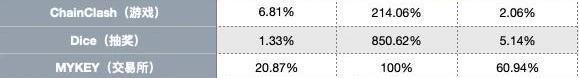 2.Tron:TronBet(抽奖,用户3136,成交量4.01亿TRX/7337万元));DICE 3D(抽奖,用户2726,成交量0.80亿TRX/1478万元);TronTrade(市场,用户798,成交量0.48亿TRX/888万元)