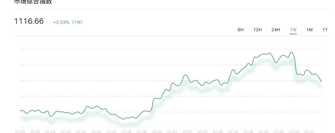 上期回顾若情绪指数重新站上1以上,市场将投资热情将转暖。7月9日标准共识情绪指数最新数值为1.1,重新站上1区间,之后开始展开币种轮动上涨,标准共识市场综合指数最高上涨超7%。指数要点根据标准共识市场综合指数反映,最新指数为1,116.66,本周上涨3.33%,与相关主流币种比较,上涨幅度处于中游水平,稳定性较强。市场整体冲高回落,BTC涨幅较弱,资金主要在其他主流币种中产生轮动,预计最终资金仍将流回BTC。