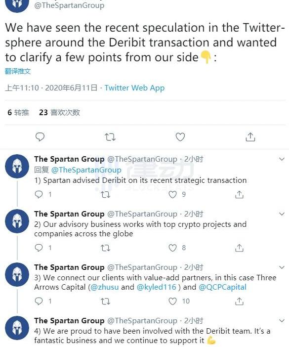 对于这件事,SpartanGroup也刚刚在推特上进行了回复。该公司发文称已经看到了最近在Twitter上关于Deribit交易的猜测,并希望澄清几点:1.SpartanGroup只是为Deribit最近的战略交易提供咨询;2.我们的咨询业务与全球顶级加密项目和公司合作;3.我们为客户联系增值合作伙伴,这里指的是ThreeArrowsCapital以及QCPCapital;4.能参与到Deribit团队中,我们感到很自豪。这是一个很棒的业务我们将继续支持它。