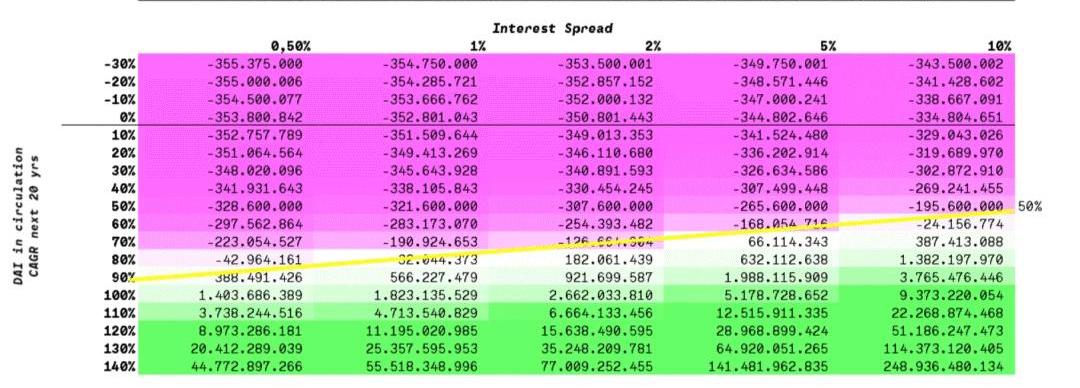 现在,让我们看一下利润预测的变化方式,改变两个关键变量:Dai的未来流通年增长率以及由此产生的未来利差。