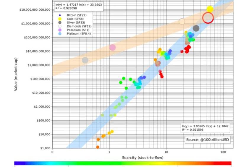 图表9比特币长期用户的增长速度对比特币价格有影响如图所示,模型认为如果用户数增长速度没有大的变化,比特币的价格可能在2021年达到50,000美元以上。稀缺性S2F模型该模型的主要论点为比特币作为与黄金很相似的用稀缺性及货币溢价估值的准货币,使用黄金估值模型S2F来测算比特币的稀缺性有重要参考意义。模型结论如下图所示: