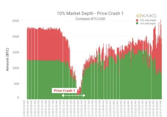 随着价格在上午10:30左右开始下跌,我们观察到Coinbase订单簿的市场深度突然减少。在第一次价格暴跌结束后,10%的市场深度还不到上午10:30之前交易量的1/4。随着做市商重新调整头寸,市场深度迅速回升。