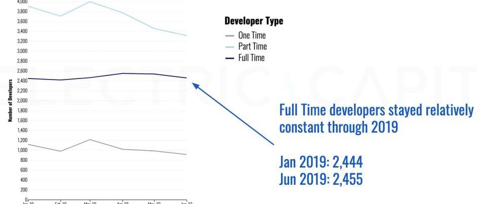 由ElectricCapital发布的报告可以看到,从2018年6月到2019年6月,区块链开发者数量有所减少,减少了800多人,占比10.4%。