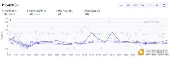 此外,下图是TheHeartProject过去 24 小时内的价格变化图,平均价格上涨了 11.3%。尽管地板价下降的幅度超过了这个幅度——表明地板价与项目中的其他事件之间存在巨大差距,仅仅透过地板价数据一个维度有时会产生误导。通过将所有必要数据合并到一张图表中的清晰图表,可以在价格趋势中发现更多的东西。根据NFTGo.io价格多维走势图,当地板价下降过程中,平均价格依旧上升,同时有活跃的高价NFT成交,这会预示一个较好的势头。