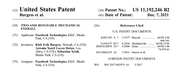 一项2021年12月批准的「机械眼球100」(mechanical eyeball 100)文件称,这个金属球体是一个类似于人眼的机器眼,有两个相交于中心点的旋转轴。