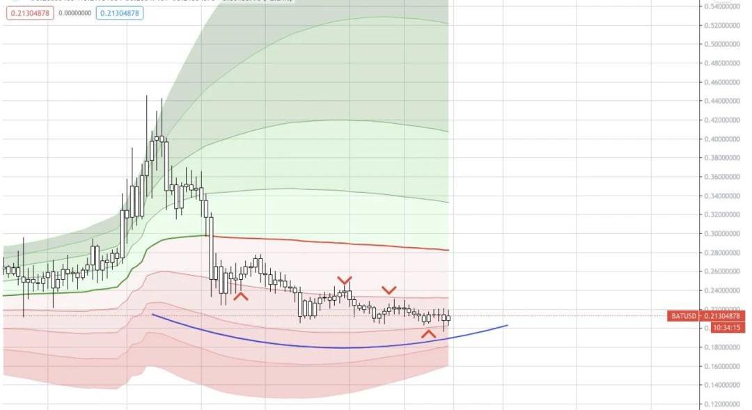 在盘整之后,出现了一段时间的重大损失。亏损之前,出现了从0.24美元到0.42美元的非凡走势。这导致BAT的价格在半个月内几乎上涨了100%。在此之前,BAT与其他市场相比,并没有出现什么惊人的变化,在一个平行的通道内交易,然后是一个横向的时期,然后是突破。