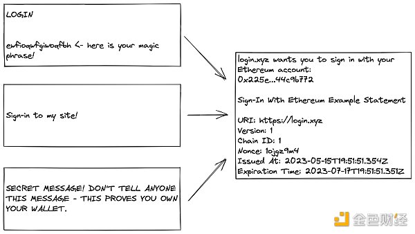 连接钱包后的第一步是为用户提供人类可读的信息,以便他们了解自己正在进入什么状态。 有很多情况下,用户会看到“登录(LOGIN)”,一些关于“登录”的不一致的措辞,甚至有时只是一个任意数字(“在这里,签署这组随机的疯狂字母和数字”)。 相反,我们可以根据现有的实践、一些良好的安全措施以及在人类可读性和安全性之间取得平衡的严格语法来定义一组必填字段。 此外,钱包不必改变其现有的界面和做法,至少可以继续为用户提供这种信息。