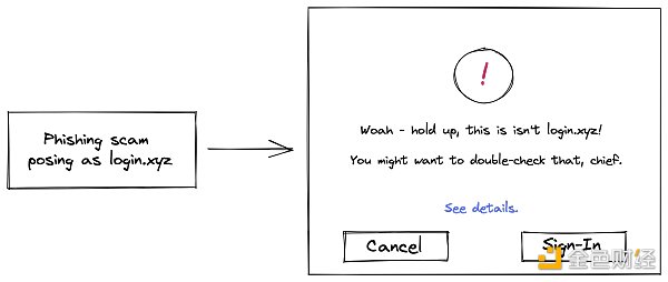 该规范还为钱包引入了额外的安全要求,例如防止网络钓鱼攻击的域绑定和防止重放攻击的随机数,在整个体验过程中进一步保护用户。 例如,如果钱包找到有效的 SIWE 消息,但用户正在为 example.com 签名,但实际上是在 exampie.com 上,则钱包可以警告用户以下情况: