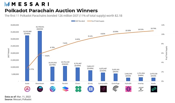 经过11次拍卖,1.26亿DOT(占总供应量的11%;价值21亿美元)已经被质押。第一批中标者(拍卖1-5)于2021年12月17日登上了Polkadot。第二批中标者(拍卖6-11)于2022年3月11日入驻Polkadot。每位获奖者都为Polkadot的生态系统带来了独特的功能和用例。