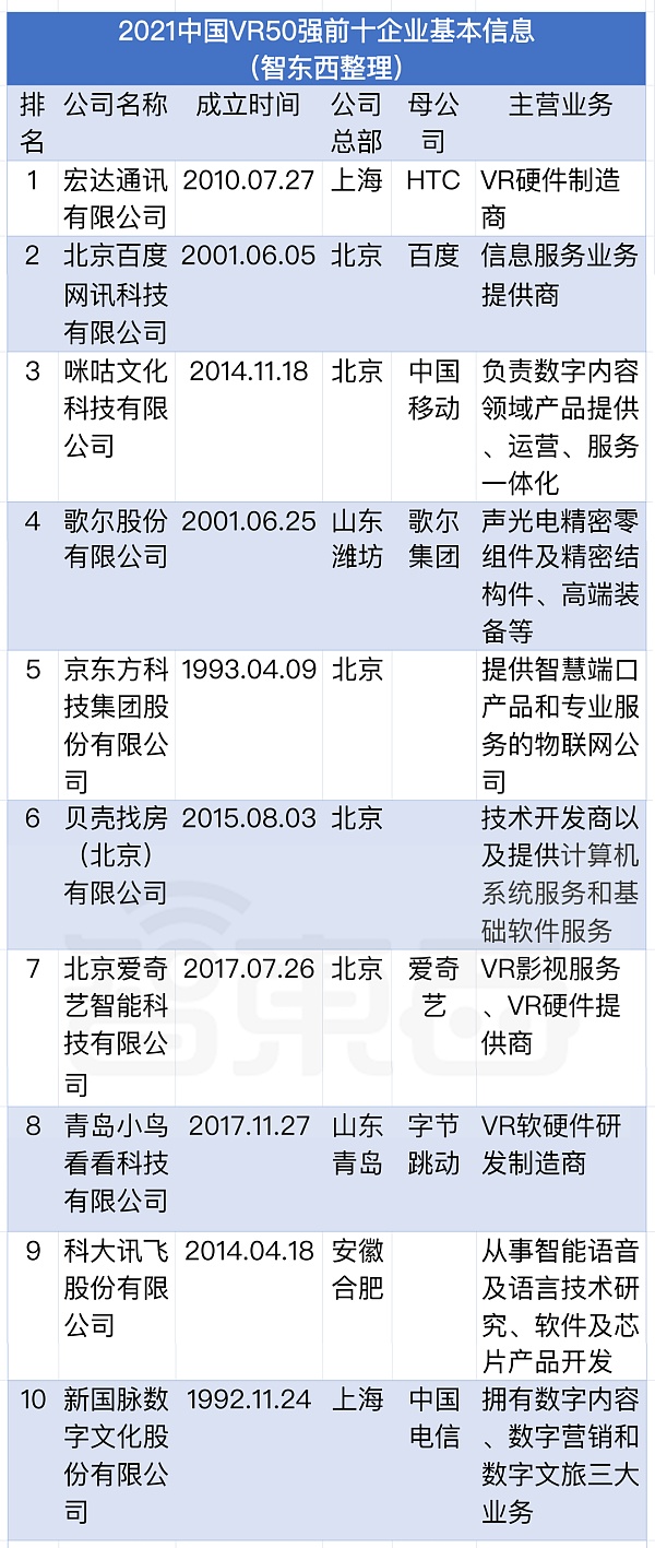 我们分析了2021年中国VR50强企业的公司总部,发现排名靠前的十大VR企业,其中有一半以上的企业总部在北京,分别各有两家在山东和上海,还有一家在安徽。