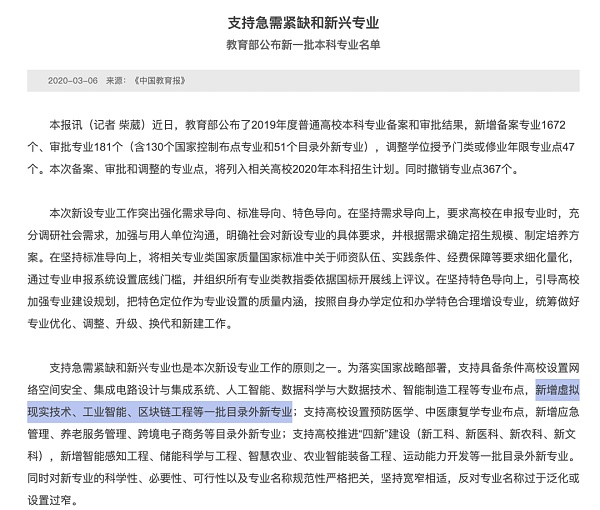 随着国家对VR产业的重视,全国共有18所高校获教育部批准开设“VR技术”本科专业,其中有五所都在江西省,分别为江西财经大学、华东交通大学、江西理工大学、江西科技师范大学以及江西软件职业技术大学。