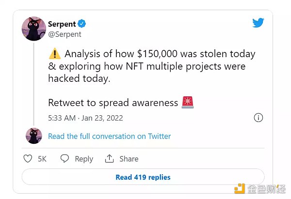 前文所说的 OpenSea 的 Discord 被攻击发出的钓鱼网址,以及本人下面推特分享的案例都是这种方式。